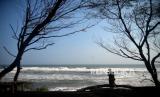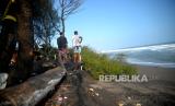 Pengunjung melihat pohon cemara udang yang ambruk karena abrasi di Pantai Trisik, Kulonprogo, Yogyakarta, Selasa (1/8/2023). Sebanyak lima pohon besar jenis cemara udang yang ditanam sebagai penahan ombak ambruk imbas abrasi. Tiga warung di samping pohon juga terancam ambruk dan bisa membahayakan pengunjung. Abrasi kali ini merupakan yang terparah selama lima tahun terakhir, panjang pantai yang hilang terkikis mencapai 100 meter. (FOTO : Republika/Wihdan Hidayat)