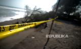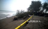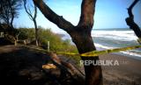 Garis batas Polisi terpasang di sekitar lokasi ambruknya pohon cemara udang, Pantai Trisik, Kulonprogo, Yogyakarta, Selasa (1/8/2023). Sebanyak lima pohon besar jenis cemara udang yang ditanam sebagai penahan ombak ambruk imbas abrasi. Tiga warung di samping pohon juga terancam ambruk dan bisa membahayakan pengunjung. Abrasi kali ini merupakan yang terparah selama lima tahun terakhir, panjang pantai yang hilang terkikis mencapai 100 meter. (FOTO : Republika/Wihdan Hidayat)
