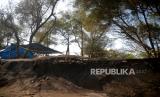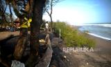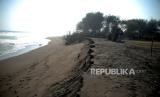 Kondisi bibir pantai yang terkena abrasi di Pantai Trisik, Kulonprogo, Yogyakarta, Selasa (1/8/2023). Sebanyak lima pohon besar jenis cemara udang yang ditanam sebagai penahan ombak ambruk imbas abrasi. Tiga warung di samping pohon juga terancam ambruk dan bisa membahayakan pengunjung. Abrasi kali ini merupakan yang terparah selama lima tahun terakhir, panjang pantai yang hilang terkikis mencapai 100 meter. (FOTO : Republika/Wihdan Hidayat)