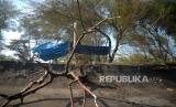 Salah pohon cemara udang yang ambruk karena abrasi di Pantai Trisik, Kulonprogo, Yogyakarta, Selasa (1/8/2023). Sebanyak lima pohon besar jenis cemara udang yang ditanam sebagai penahan ombak ambruk imbas abrasi. Tiga warung di samping pohon juga terancam ambruk dan bisa membahayakan pengunjung. Abrasi kali ini merupakan yang terparah selama lima tahun terakhir, panjang pantai yang hilang terkikis mencapai 100 meter. (FOTO : Republika/Wihdan Hidayat)