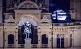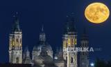 Supermoon Sturgeon di atas basilika El Pilar di Zaragoza, Spanyol, Selasa, (1/8/2023). (FOTO : EPA-EFE/Javier Cebollada)
