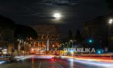 Supermoon terbit di atas Colosseum dan Forum Romawi, di Roma, Selasa, (1/8/2023). (FOTO : AP Photo/Andrew Medichini)