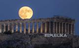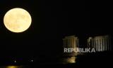 Supermoon terbit di belakang kuil kuno Poseidon di Cape Sounion, sekitar 70 kilometer (45 mil) selatan Athena, Yunani, Selasa, (1/8/2023). (FOTO : AP Photo/Thanassis Stavrakis)