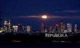 Supermoon terbit di atas gedung-gedung distrik perbankan di Frankfurt, Jerman, selasa (1/8/2023). (FOTO : AP Photo/Michael Probst)