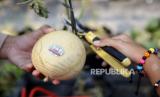 Pengunjung memotong buah melon jenis baby sweet premium di Green House Masjid Agung Jawa Tengah (MAJT), Kota Semarang, Jawa Tengah, Rabu (2/8/2023). MAJT menyediakan kawasan agrowisata bagi pengenjung sebanyak enam green house yang ditanami buah melon. Setiap pengunjung yang hendak memebeli buah melon dapat merasakan sensasi memetik buah melon langsung dari kebunnya dengan harga perkilo sekitar Rp30 ribu. (FOTO : Republika/Thoudy Badai)