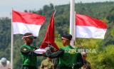 Peserta pengibar bendera membuka bendera saat pengibaran bendera Merah Putih simbolis di puncak Gunung Salak, Aceh Utara, Aceh, Rabu (93/8/2023). TNI Kodim 0103 Aceh Utara meprakarsai pemasangan 2000 bendera Merah Putih di kawasan puncak Gunung Salak untuk menyambut perayaan HUT ke-78 Republik Indonesia.  (FOTO : Antara/Rahmad)