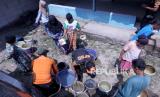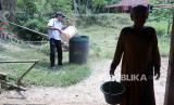 Sejumlah warga menyimpan air bersih yang diperoleh dari truk tangki yang menyalurkan bantuan air bersih di Desa Weninggalih Kecamatan Jonggol, Kabupaten Bogor, Kamis (3/8/2023). (FOTO : EPA-EFE/BAGUS INDAHONO)