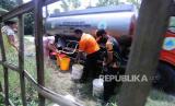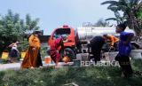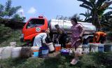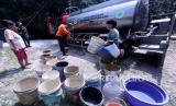 REPUBLIKA.CO.ID, BOGOR -- Sejumlah warga mengambil air bersih dari truk tangki yang menyalurkan bantuan air bersih di Desa Weninggalih Kecamatan Jonggol, Kabupaten Bogor, Kamis (3/8/2023).