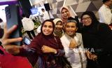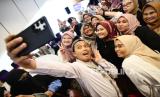 Ustad Maulana, berswafoto bersama nasabah di sela peluncuran program Customer Get Customer di Muamalat Tower, Jakarta, Kamis (3/8). Program Customer Get Customer menyediakan hadiah berupa emas dan porsi haji bagi nasabah yang dapat mengajak pihak lain menjadi nasabah baru. (FOTO : Republika/Yogi Ardhi)