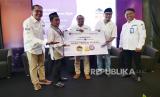 Direktur Operasi dan Digital PT Bank Muamalat Indonesia Tbk Wahyu Avianto (kedua kanan) didampingi Direktur Keuangan dan Strategi Bank Muamalat Suhendar (kanan) bersama ustad Maulana, influencer Ari Untung meluncurkan program Customer Get Customer di Muamalat Tower, Jakarta, Kamis (3/8). Program Customer Get Customer menyediakan hadiah berupa emas dan porsi haji bagi nasabah yang dapat mengajak pihak lain menjadi nasabah baru. (FOTO : Republika/Yogi Ardhi)