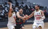 REPUBLIKA.CO.ID,JAKARTA -- Pebasket Indonesia Patriots Antoni Erga (tengah) berusaha melewati adangan pebasket timnas Suriah Hani Adribe (kanan) dan Majd Arbasha (kiri) saat pertandingan Indonesia International Basketball Invitational (IIBI) di Indonesia Arena, Jakarta, Jumat (4/8/2023).