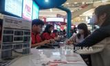 Pengunjung mencari informasi promo tiket yang ditawarkan pada Cathay Pacific Travel Fair 2023 di Jakarta, Jumat (4/8/2023). Pameran wisata yang digelar untuk ketujuh kalinya ini berlangsung serentak di Senayan City (Jakarta) dan Tunjungan Plaza 6 (Surabaya) pada Jumat hingga Minggu, 4-6 Agustus 2023. Nasabah CIMB Niaga bisa mendapatkan voucher diskon tiket pesawat hingga Rp6,8 juta berupa cashback, cicilan 0% sampai 12 bulan, dan hemat hingga 100% pakai Poin Xtra. (FOTO : Republika/Prayogi)