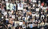 Mereka membawa poster dan foto kerabat mereka yang menjadi korban pada ledakan tersebut (FOTO : EPA-EFE/WAEL HAMZEH)