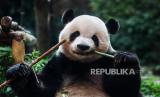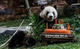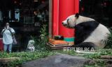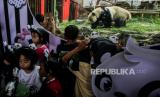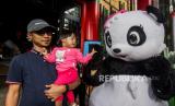 REPUBLIKA.CO.ID, BOGOR -- Seorang anak bersalaman dengan badut berkostum panda di Istana Panda Taman Safari Indonesia Bogor, Jawa Barat, Sabtu (5/8/2023). Taman Safari Indonesia Bogor merayakan ulang tahun ke-13 Panda jantan bernama Cai Tao asal Cina yang lahir pada 4 Agustus 2007. Peringatan ulang tahun Cai Tao tersebut dirayakan bersama pengunjung dan hidangan kue es untuk panda tersebut.