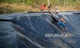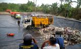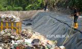 Pekerja memasang terpal di TPST Tamanmartani, Sleman, Yogyakarta, Senin (7/8/2023). Pemkab Sleman mulai mengoperasikan TPST Tamanmartani, Kalasan, Sleman untuk pembuangan sampah untuk 45 hari ke depan. Lokasi TPST ini nanti akan menampung 50 ton sampah. Pada hari pertama pengoperasian sebanyak 5 truk sampah yang membongkar muatan, selanjutnya targetnya 10 truk setiap harinya. (FOTO : Republika/Wihdan Hidayat)