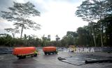 Petugas meratakan San menyemprot cairan penghilang bau di TPST Tamanmartani, Sleman, Yogyakarta, Senin (7/8/2023). Pemkab Sleman mulai mengoperasikan TPST Tamanmartani, Kalasan, Sleman untuk pembuangan sampah untuk 45 hari ke depan. Lokasi TPST ini nanti akan menampung 50 ton sampah. Pada hari pertama pengoperasian sebanyak 5 truk sampah yang membongkar muatan, selanjutnya targetnya 10 truk setiap harinya. (FOTO : Republika/Wihdan Hidayat)
