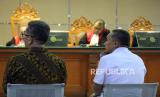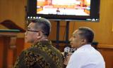 Tersangka kasus korupsi Bandung Smart City, Kepala Dishub Dadang Darmawan dan Wali Kota Bandung nonaktif Yana Mulyana (kanan), menyampaikan keterangan saat hadir menjadi saksi di Pengadilan Negeri (PN), Kota Bandung, Senin (7/8/2023). Mereka hadir menjadi saksi tiga orang terdakwa dari pihak perusahaan. Dalam sidang tersebut mereka dicecar pertanyaan terkait kasus dugaan suap dan penerimaan gratifikasi pengadaan pengadaan CCTV dan internet service provider (ISP) tahun 2022-2023. (FOTO : Edi Yusuf/Republika)