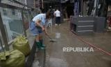 Para pekerja membersihkan lumpur dari toko mereka setelah banjir dari sungai yang meluap di distrik Mentougou di pinggiran Beijing, Senin, (7/8/2023). (FOTO : AP Photo/Andy Wong)