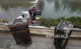Warga mencuci koper dan barang-barang mereka yang terkena lumpur di tepi kanal di distrik Mentougou di pinggiran Beijing, Senin, (7/8/2023). (FOTO : AP Photo/Andy Wong)