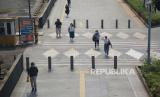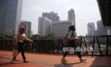 REPUBLIKA.CO.ID,JAKARTA -- Warga melintas memakai masker untuk melindungi diri dari debu di jembatan penyeberangan sepeda (JPS) sekaligus jembatan penyeberangan orang (JPO) di Jalan Sudirman, Jakarta, Selasa (8/8/2023).