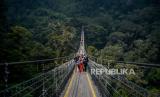 REPUBLIKA.CO.ID, BANDUNG -- Pengunjung menyeberangi jembatan gantung rengganis di Patengan, Rancabali, Kabupaten Bandung, Jawa Barat, Selasa (8/8/2023).