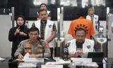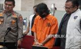 Tersangka dihadirkan saat rilis kasus tindak pidana akses ilegal dalam peretasan kartu kredit untuk pembayaran secara elektronik di Bareskrim, Mabes Polri, Jakarta, Selasa (8/8/2023). Ditipidsiber Bareskrim Polri bekerja sama dengan pihak Kepolisian Jepang (NPA) dengan dukungan dari KBRI Tokyo berhasil mengungkap kejahatan hacking untuk melakukan ilegal akses dalam pembelian barang-barang elektronik secara online di Jepang. Tersangka berjumlah 2 orang, 1 orang inisial DK telah ditangkap dan ditahan oleh Dittipidsiber Bareskrim Polri dan 1 orang inisial SB yang menjalani proses hukum di Kepolisian Osaka Jepang. (FOTO : Prayogi/Republika)