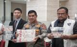Direktur Tindak Pidana Siber Bareskrim Polri Brigjen Adi Vivid Agustiadi Bachtiar (kanan) dan Karopenmas Divisi Humas Polri Brigjen Ahmad Ramadhan (tengah) menunjukan barang bukti saat rilis kasus tindak pidana akses ilegal dalam peretasan kartu kredit untuk pembayaran secara elektronik di Bareskrim, Mabes Polri, Jakarta, Selasa (8/8/2023). Ditipidsiber Bareskrim Polri bekerja sama dengan pihak Kepolisian Jepang (NPA) dengan dukungan dari KBRI Tokyo berhasil mengungkap kejahatan hacking untuk melakukan ilegal akses dalam pembelian barang-barang elektronik secara online di Jepang. Tersangka berjumlah 2 orang, 1 orang inisial DK telah ditangkap dan ditahan oleh Dittipidsiber Bareskrim Polri dan 1 orang inisial SB yang menjalani proses hukum di Kepolisian Osaka Jepang. (FOTO : Prayogi/Republika)