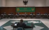 REPUBLIKA.CO.ID, JAKARTA -- Hakim Pengadilan Negeri Jakarta Barat Dede Suryaman (bawah) menjawab pertanyaan Majelis Kehormatan Hakim (MKH) dalam sidang di Mahkamah Agung (MA), Jakarta, Rabu (9/8/2023).