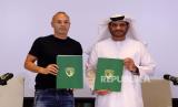 Ketua Klub Emirates Youssef Abdullah Al-Batran (kanan) dan pemain sepak bola Spanyol Andres Iniesta diperkenalkan sebagai pemain baru Klub Emirates saat konferensi pers, di Mina Al Arab, Ras Al Khaimah , Uni Emirat Arab, (9/8/2023). Klub Emirates bermain di Liga Pro UEA. (FOTO : EPA-EFE/ALI HAIDER)