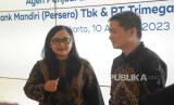 Presiden Direktur Trimegah Asset Management Antony Dirga (kanan) dan Senior Vice President Wealth Management Bank Mandiri Sista Pravesthi (kiri) berbincang usai menandatangani Perjanjian Kerja Sama Agen Penjualan Efek Reksa Dana dari Trimegah Asset Management pada Kamis (10/8/2023). Lewat kolaborasi ini, Bank Mandiri menghadirkan tiga reksa dana pilihan dari Trimegah di berbagai kelas aset yang dapat diakses melalui fitur Livin’ Investasi di SuperApp Livin’ By Mandiri. Adapun jumlah pengguna fitur Livin’ Investasi mengalami pertumbuhan mencapai hampir 120% secara year to date (ytd) dengan jumlah pengguna aktif mencapai hampir 400.000 investor per Juli 2023. Dari jumlah tersebut, lebih dari 70% merupakan investor baru. (FOTO : Republiika/Tahta Aidilla)