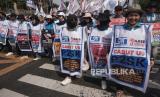 REPUBLIKA.CO.ID,JAKARTA - Buruh melakukan long march menuju kawasan Patung Kuda Monas, Jakarta, Kamis (10/8/2023).