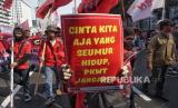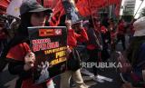 Buruh melakukan long March menuju kawasan Patung Kuda Monas, Jakarta, Kamis (10/8/2023). Aksi yang diikuti ribuan buruh dari berbagai element tersebut meminta pemerintah dan DPR mencabut UU Omnibus Law Cipta Kerja yang telah disahkan. (FOTO : Prayogi/Republika)