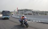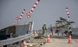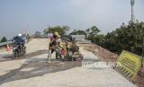 Pekerja merapikan area Jembatan Cibiru Hilir sebelum diresmikan di Stasiun Kereta Cepat Tegalluar, Cibiru Hilir, Kabupaten Bandung, Jawa Barat, Kamis (10/8/2023). PT KCIC meresmikan Jembatan Cibiru Hilir yang merupakan salah satu akses menuju Stasiun Kereta Cepat Tegalluar. Jembatan yang menghubungkan Jalan Sor GBLA dengan Cibiru Hilir tersebut memiliki panjang sekitar 300 meter dan lebar sembilan meter.   (FOTO : ABDAN SYAKURA/REPUBLIKA)