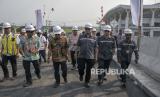 Direktur Utama PT KCIC Dwiyana Slamet Riyadi (ketiga kanan) bersama Bupati Bandung Dadang Supriatna (ketiga kiri) meninjau Jembatan Cibiru Hilir usai diresmikan di Stasiun Kereta Cepat Tegalluar, Cibiru Hilir, Kabupaten Bandung, Jawa Barat, Kamis (10/8/2023). PT KCIC meresmikan Jembatan Cibiru Hilir yang merupakan salah satu akses menuju Stasiun Kereta Cepat Tegalluar. Jembatan yang menghubungkan Jalan Sor GBLA dengan Cibiru Hilir tersebut memiliki panjang sekitar 300 meter dan lebar sembilan meter. (FOTO : ABDAN SYAKURA/REPUBLIKA)