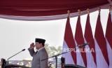 Menteri Pertahanan Prabowo Subianto memberikan penghormatan saat Upacara Penetapan Komponen Cadangan Tahun 2023 di Lapangan Pusdiklatpassus, Batujajar, Kabupaten Bandung Barat, Jawa Barat, Jumat (11/8/2023). Menteri Pertahanan Prabowo Subianto menetapkan sebanyak 2.497 personel Komcad TNI Tahun 2023. Komcad tersebut merupakan sumber daya yang disiapkan untuk dikerahkan melalui mobilisasi untuk memperbesar dan memperkuat kekuatan serta kemampuan komponen utama. (FOTO : ABDAN SYAKURA/REPUBLIKA)