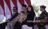 Menteri Pertahanan Prabowo Subianto (kedua kiri) bersama Menko Polhukam Mahfud MD (kiri) dan Ketua Komisi 1 DPR Meutya Viada Hafid (ketiga kiri) saat menghadiri Upacara Penetapan Komponen Cadangan Tahun 2023 di Lapangan Pusdiklatpassus, Batujajar, Kabupaten Bandung Barat, Jawa Barat, Jumat (11/8/2023). Menteri Pertahanan Prabowo Subianto menetapkan sebanyak 2.497 personel Komcad TNI Tahun 2023. Komcad tersebut merupakan sumber daya yang disiapkan untuk dikerahkan melalui mobilisasi untuk memperbesar dan memperkuat kekuatan serta kemampuan komponen utama. (FOTO : ABDAN SYAKURA/REPUBLIKA)