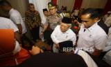 Wakil Presiden Maruf Amin (kedua kanan) menyalami salah satu peserta saat menghadiri pembukaan Rapat Kerja Nasional (Rakernas) Ikatan Pesantren Indonesia (IPI) 2023 di Surabaya, Jawa Timur, Jumat (11/8/2023). Rakernas yang digelar hingga 13 Agustus tersebut mengusung tema Berbenah Organisasi di Tahun 2023 Menuju Kemandirian Pesantren Indonesia yang Bermartabat.  (FOTO : ANTARA FOTO/Moch Asim)