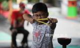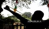 Anak-anak berlatih ketapel di Markaz Ketapel Pandan Lovers (Kepal), Tebet, Jakarta Selatan, Sabtu (12/8/2023). Latihan yang diadakan rutin seminggu dua kali oleh Komunitas Ketapel Pandan Lovers itu untuk mengenalkan permainan tradisional ketapel kepada anak-anak sekaligus melatih insting, meningkatkan konsentrasi dan mengurangi penggunaan gawai pada anak. (FOTO : Republika/Putra M. Akbar)