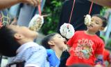 Masyarakat mengikuti lomba makan kue bolu saat Pesta Rakyat dan Silaturahmi dengan Bupati Bandung Barat di lapangan Pusdikajen, Jalan Maribaya, Kecamatan Lembang, Kabupaten Bandung Barat, Ahad (13/8/2023). Kegiatan dalam rangka memeriahkan HUT ke-78 RI ini diikuti oleh seluruh desa di kecamatan Lembang dengan berbagai kegiatan sosial dan aneka lomba permainan tradisional. (FOTO : Edi Yusuf/Republika)