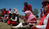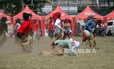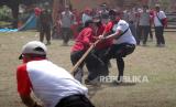 Masyarakat mengikuti lomba balap tarik tambang saat Pesta Rakyat dan Silaturahmi dengan Bupati Bandung Barat di lapangan Pusdikajen, Jalan Maribaya, Kecamatan Lembang, Kabupaten Bandung Barat, Ahad (13/8/2023). Kegiatan dalam rangka memeriahkan HUT ke-78 RI ini diikuti oleh seluruh desa di kecamatan Lembang dengan berbagai kegiatan sosial dan aneka lomba permainan tradisional. (FOTO : Edi Yusuf/Republika)