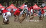 Masyarakat mengikuti lomba balap karung saat Pesta Rakyat dan Silaturahmi dengan Bupati Bandung Barat di lapangan Pusdikajen, Jalan Maribaya, Kecamatan Lembang, Kabupaten Bandung Barat, Ahad (13/8/2023). Kegiatan dalam rangka memeriahkan HUT ke-78 RI ini diikuti oleh seluruh desa di kecamatan Lembang dengan berbagai kegiatan sosial dan aneka lomba permainan tradisional. (FOTO : Edi Yusuf/Republika)