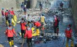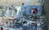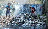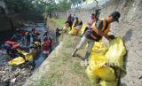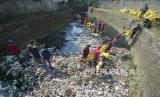 Petugas kebersihan dan Dinas Sumber Daya Air dan Bina Marga berupaya membersihkan tumpukan sampah di Sungai Cikendal, Cigondewah Kaler, Kota Bandung, Selasa (15/8/2023). Minimnya kesadaran masyarakat, masih banyak yang berprilaku buruk membuang sampah ke sungai. Membuat para petugas sering kali harus turun ke sungai membersihkan tumpukan sampah yang cukup banyak. (FOTO : Edi Yusuf/Republika)