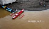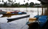 Nelayan membersihkan perahunya di Sungai Sagea, Desa Sagea, Kabupaten Halmahera Tengah, Maluku Utara, Selasa (15/8/2023). Sungai Sagea dengan panjang 7.476 kilometer dan menjadi jalur menuju objek wisata Goa Boki Maruru itu kondisi airnya berubah warna menjadi keruh akibat tercemar sedimentasi yang diduga berasal dari aktivitas pertambangan, sehingga menyebabkan warga tidak bisa lagi memanfaatkan air sungai untuk kebutuhan sehari-hari . (FOTO : Antara/Adlun fikri)
