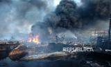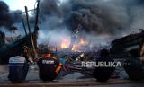 Petugas berusaha memadamkan api yang membakar kapal nelayan di Pelabuhan Jongor, Tegal, Jawa Tengah, Selasa (15/8/2023). Polairud Polda Jawa Tengah memperkirakan kerugian kebakaran 52 kapal nelayan berkisar Rp150 miliar dan hingga saat ini api masih belum padam dan asap hitam tebal menyelimuti kawasan itu. (FOTO : Antara/Oky Lukmansyah)