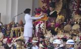 Presiden Joko Widodo (tengah) mengunakan pakaian adat Raja Pakubuwono Surakartamemberi hormat saat upacara pengibaran bendera peringatan 78 tahun kemerdekaan negara di Istana Merdeka di Jakarta, Indonesia, Kamis, (17/8/2023). (FOTO : AP Photo/Achmad Ibrahim)