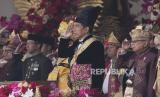 REPUBLIKA.CO.ID, JAKARTA -- Presiden Joko Widodo dan Wakil Presiden Maaruf Amin mengunakan pakaian adat saat mengikuti upacara pengibaran bendera peringatan 78 tahun kemerdekaan negara di Istana Merdeka di Jakarta, Indonesia, Kamis, (17/8/2023).
