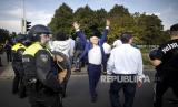 Seorang kontra-demonstran terlibat bentrok dengan petugas kepolisian bereaksi di sela-sela demonstrasi oleh pemimpin gerakan anti-Islam Pegida Belanda Edwin Wagensveld, yang merobek salinan Alquran di depan kedutaan Turki, di Den Haag, Belanda, Jumat (18/8/2023). Swedia dan Denmark keduanya mendapat tekanan dalam beberapa pekan terakhir, menyusul pembakaran kitab suci umat Islam, yang memicu ketegangan diplomatik dengan beberapa negara mayoritas Muslim. (FOTO : EPA-EFE/RAMON VAN FLYMEN)