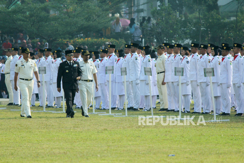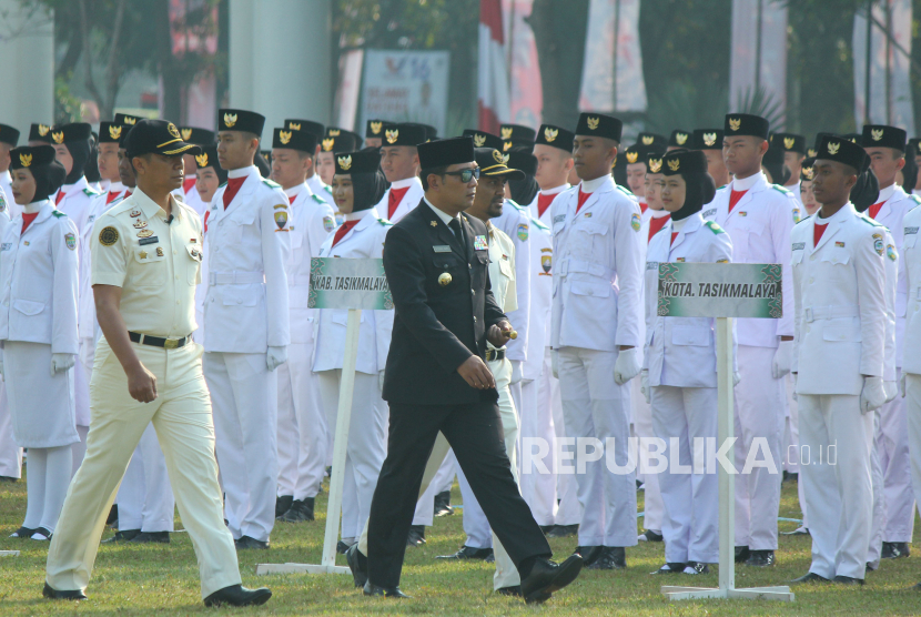REPUBLIKA.CO.ID,BANDUNG -- Gubernur Jawa Barat Ridwan Kamil meninjau barisan saat Apel Besar Paskibraka Se-Jawa Barat Tahun 2023 di halaman belakang, Gedung Sate, Kota Bandung, Ahad (20/8/2023).