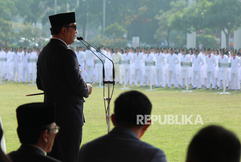 Gubernur Jawa Barat Ridwan Kamil menyampaikan sambutan saat Apel Besar Paskibraka Se-Jawa Barat Tahun 2023 di halaman belakang, Gedung Sate, Kota Bandung, Ahad (20/8/2023). Apel Besar bertajuk Paskibraka Sebagai Pengawal Pancasila untuk Indonesia Juara lahir dan Batin ini merupakan acara rutin untuk mempererat silaturahim para Paskibraka seluruh angkatan se-Jawa Barat. Apel Besar Paskibraka dihadiri sekitar 5.000 anggota Paskibraka dari 27 kabupaten/kota di Jawa Barat. (FOTO : Edi Yusuf/Republika)