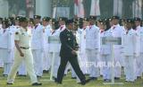 Gubernur Jawa Barat Ridwan Kamil meninjau barisan saat Apel Besar Paskibraka Se-Jawa Barat Tahun 2023 di halaman belakang, Gedung Sate, Kota Bandung, Ahad (20/8/2023). Apel Besar bertajuk Paskibraka Sebagai Pengawal Pancasila untuk Indonesia Juara lahir dan Batin ini merupakan acara rutin untuk mempererat silaturahim para Paskibraka seluruh angkatan se-Jawa Barat. Apel Besar Paskibraka dihadiri sekitar 5.000 anggota Paskibraka dari 27 kabupaten/kota di Jawa Barat. (FOTO : Edi Yusuf/Republika)